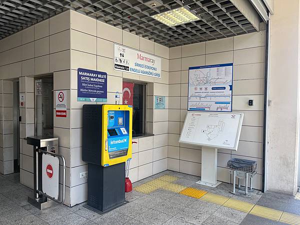 我們旅館步行到馬爾馬拉車站(Sirkeci Marmaray Atation )其中一個入口,發現只有一台黃色的售票機,傳說中不找零的黃色機台(其實,後來發現藍色機器也是不找零,會直接把你把空卡的餘額,直接儲值進卡片裡),我們遇到的這台黃色機器,也剛好無法購買單程車票,站員說也無法用信用卡直接刷卡進入車站,我們唯一選擇是買伊斯坦堡卡,空卡目前已經漲到了165里拉,女兒放了一張100元紙鈔進去,想要放第二張,發現機器一直說金額低於需要的費用??