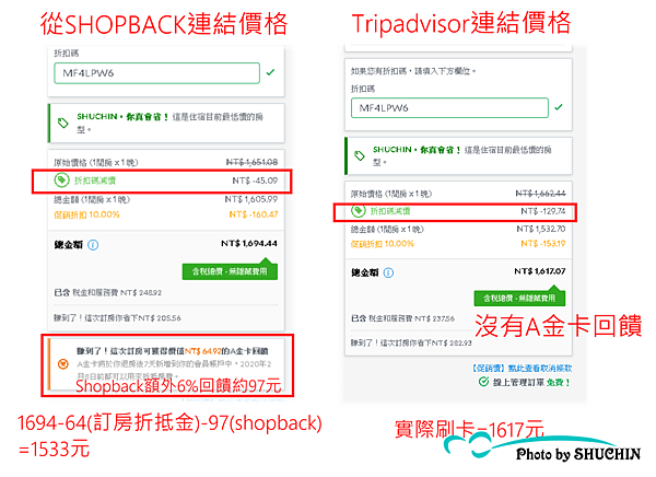 P.S 為什麼以上說明是原則上,跟大家解釋說明一下,以Agoda訂房網為例,如果從tripadvisor搜尋比價後,目前連結進去會有"減價折扣碼",而從shopback連結進去也會有"減價折扣碼",但是減價金額少於從Tripadvisor。所以,乍看之下,好像從shopback連過去金額變貴,但是,事實上,比較便宜。